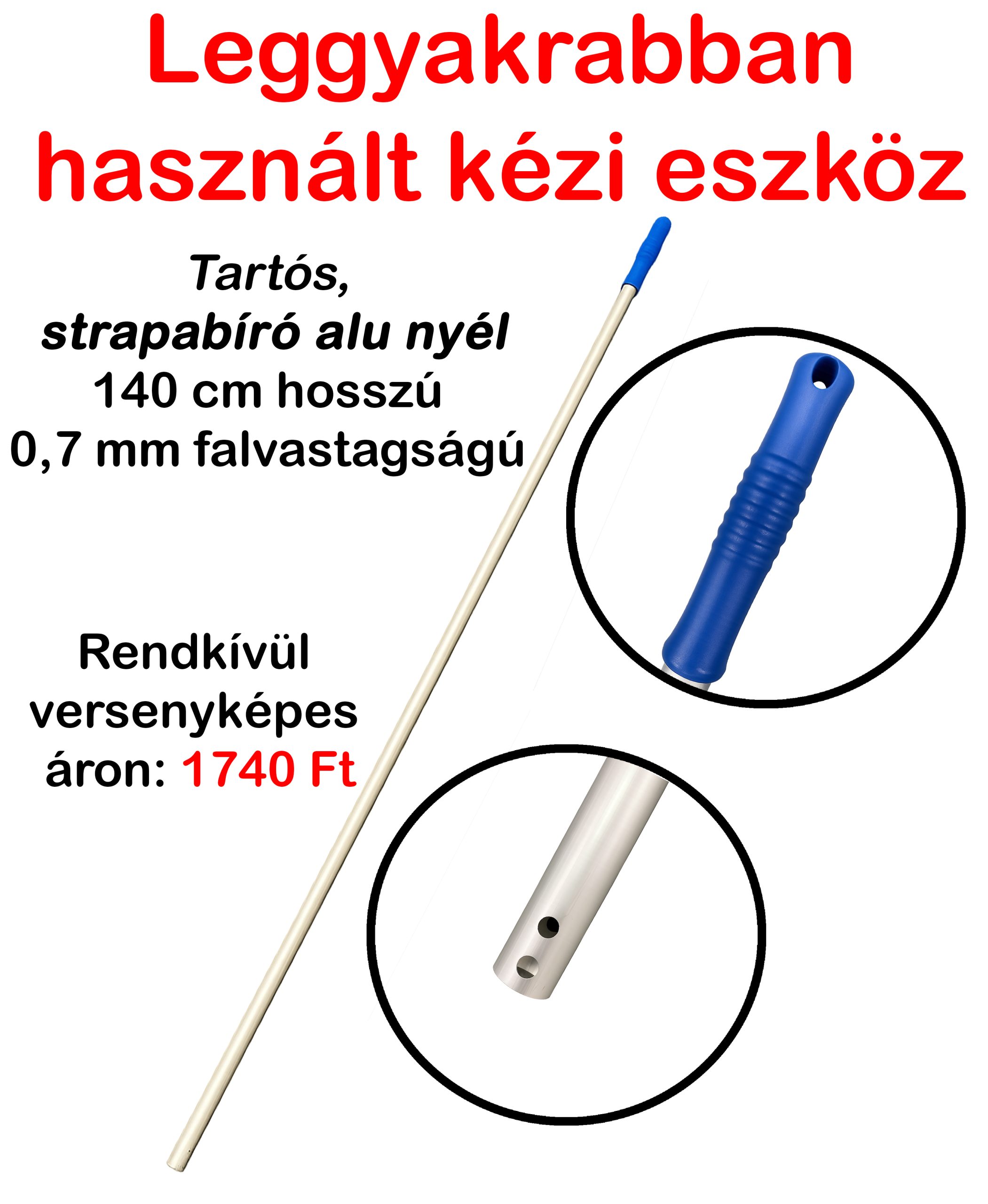 140 cm hosszú alu nyél, tartós,strapabíró, 0,7 mm falvastagságú